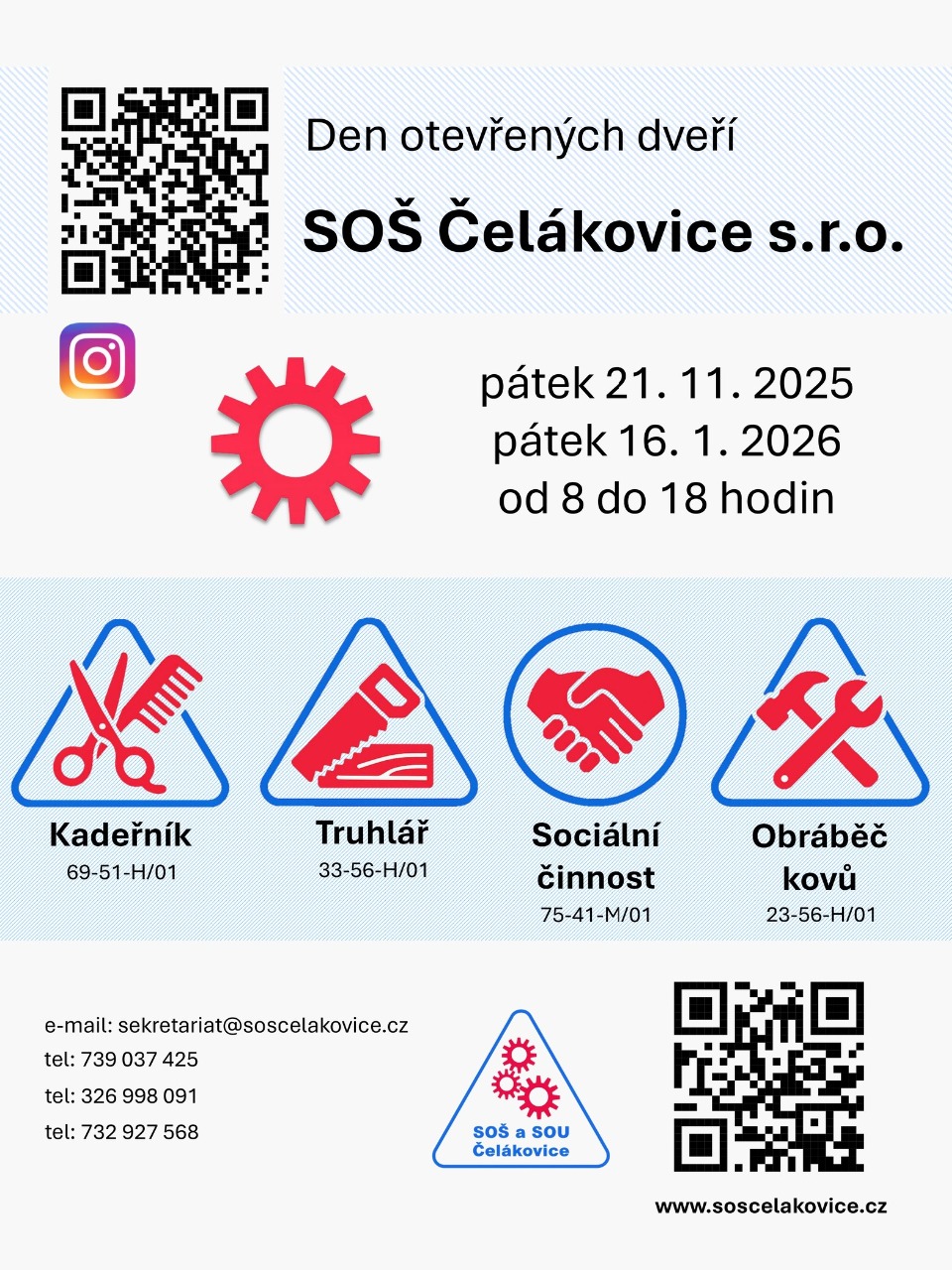Detailní informaci naleznete DNE 15.5.2024 na těchto webových stránkách v sekci PRO UCHAZEČE O STUDIUM. Odkaz: https://www.soscelakovice.cz/pro-zajemce-o-studium/
