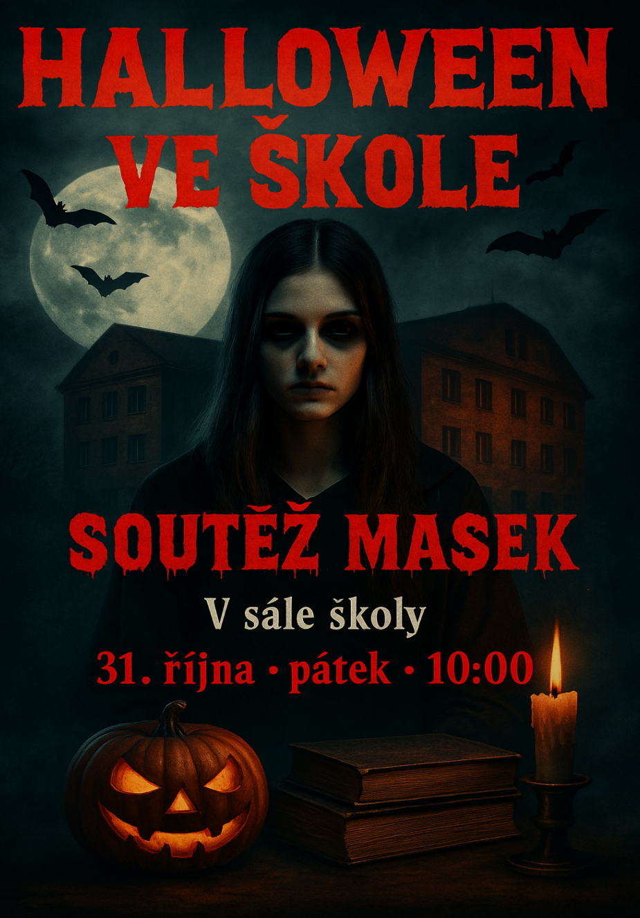 Zveme všechny žáky a učitele na školní Halloween! Kdy? V pátek 31. října. Přijďte v maskách a užijte si strašidelnou atmosféru. V 10:00 se na sále školy uskuteční soutěž o nejlepší masku. Ceny čekají na vítěze! Těšíme se na vaši účast.